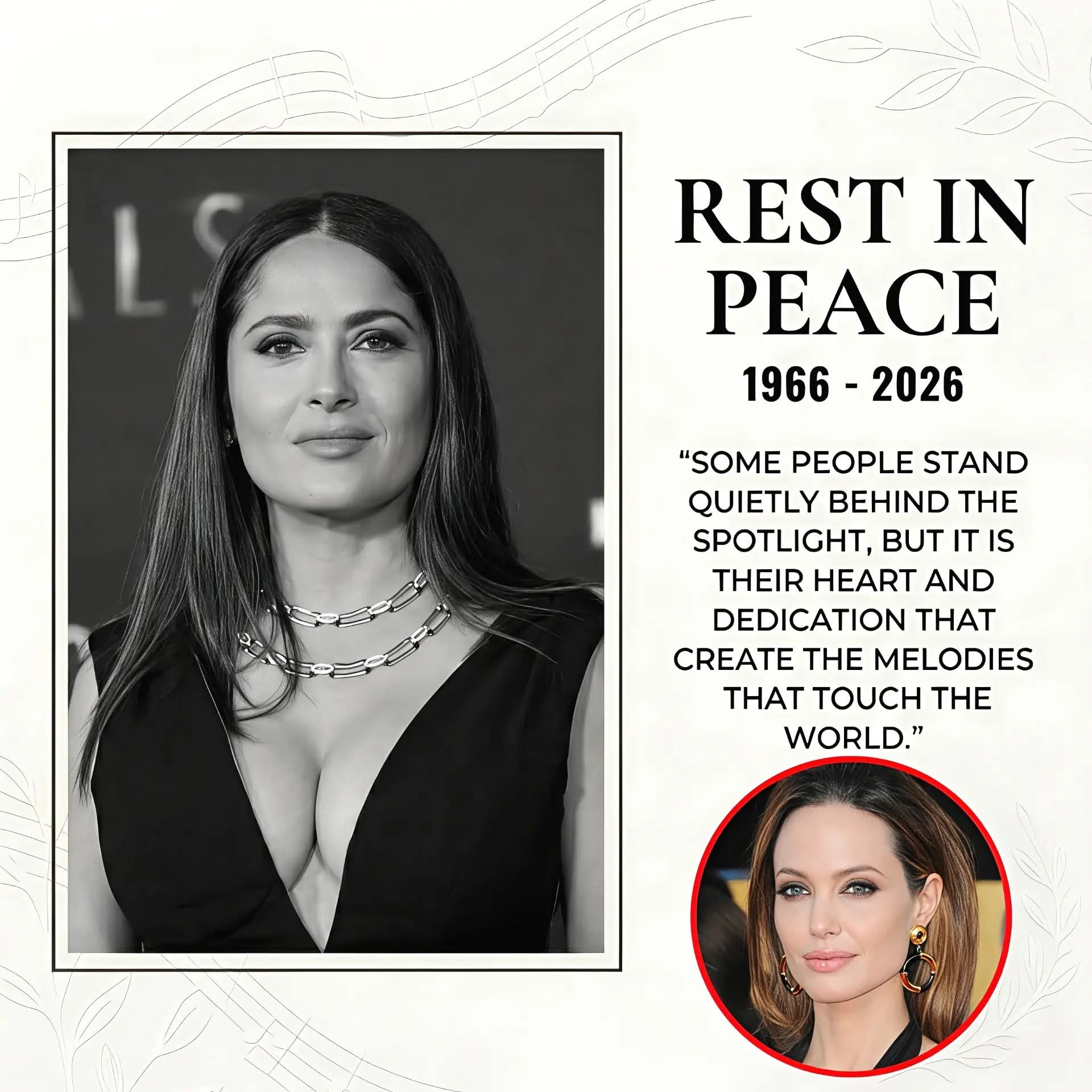 A heartbreaking loss for Angelina Jolie and the entire Hollywood community. Salma Hayek has tragically passed away at 58 after a sudden medical emergency, leaving behind her beloved husband François-Henri Pinault and their daughter Valentina. Known for her fiery passion, unbreakable resilience, and boundless kindness, she is deeply mourned by fans, co-stars, and crew. Angelina Jolie and the entertainment family rally in prayer and remembrance, honoring Salma’s fierce spirit and radiant smile. The void she leaves is irreplaceable. As support grows for her family, Salma’s courage and dedication will never be forgotten. Rest in peace, Salma. 🚨 Continue reading :