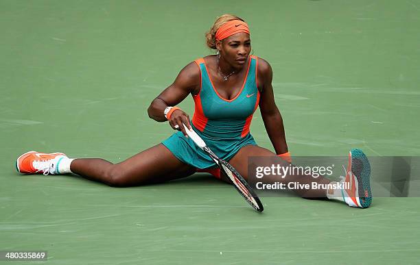 KEY BISCAYNE, FL – MARCH 24: Serena Williams of the United States does the splits against Coco Vandeweghe of the United States during their fourth round match during day 8 at the Sony Open at Crandon Park Tennis Center on March 24, 2014 in Key Biscayne, Florida. (Photo by Clive Brunskill/Getty Images)