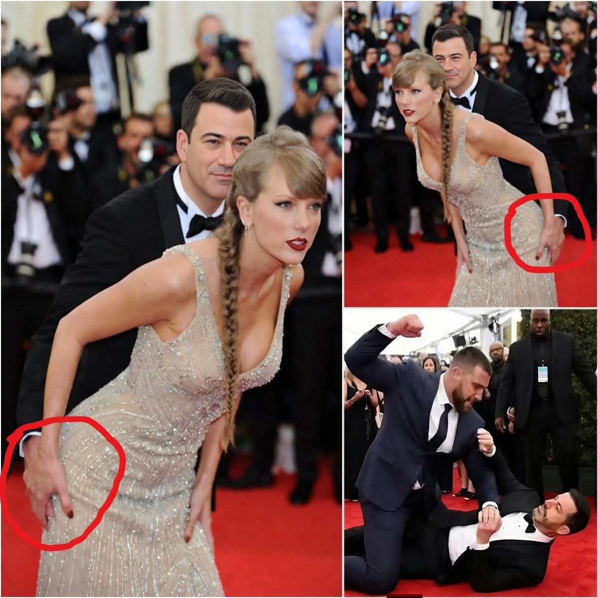 UNBELIEVABLE! The red carpet turned into a chaotic battleground! Taylor Swift’s boyfriend Travis Kelce just beat Jimmy Kimmel right in front of hundreds of cameras! It all started with a slip and Jimmy Kimmel’s hand being placed in the wrong room……