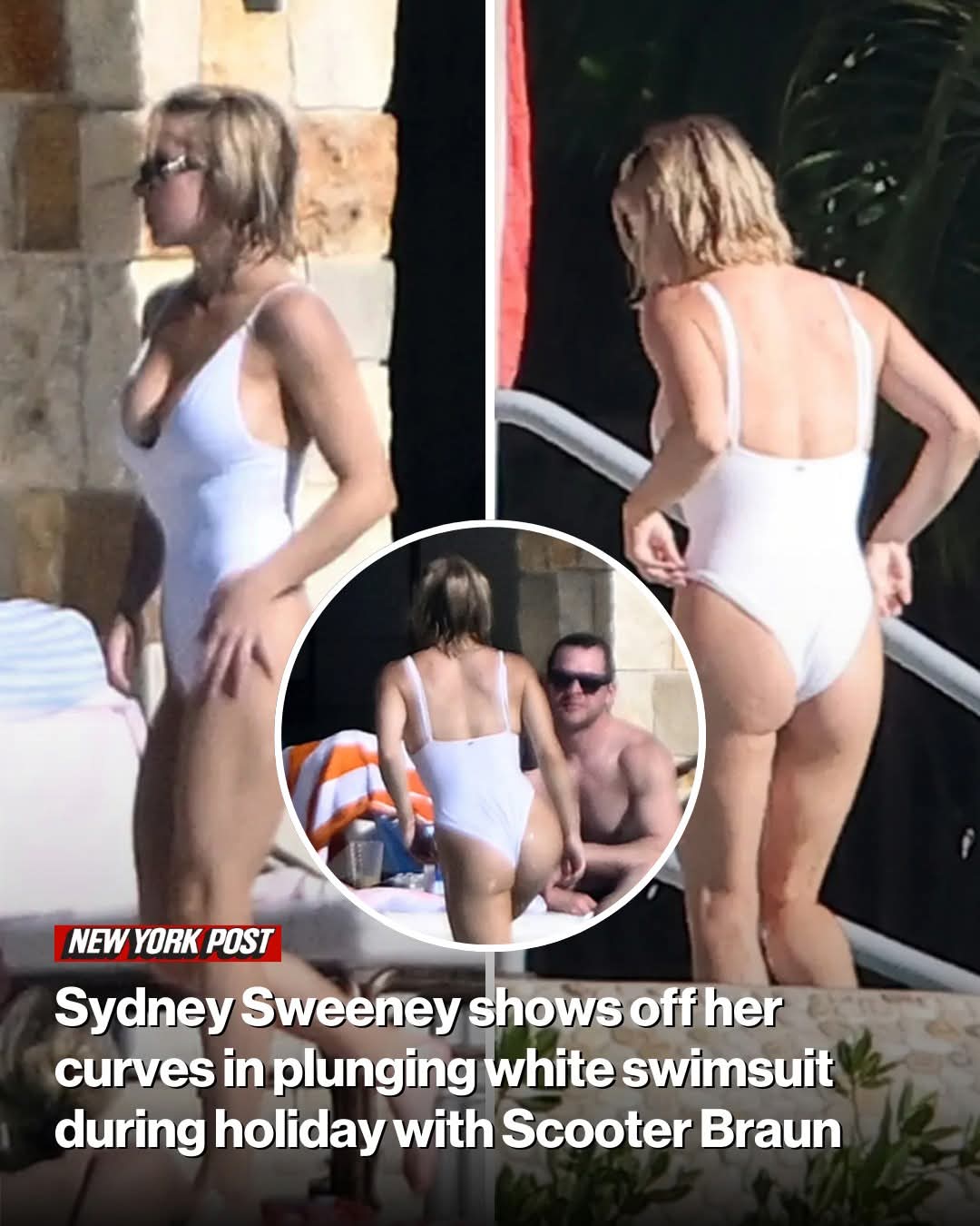 Sydney Sweeney shows off her curves in plunging white swimsuit during holiday with Scooter Braun