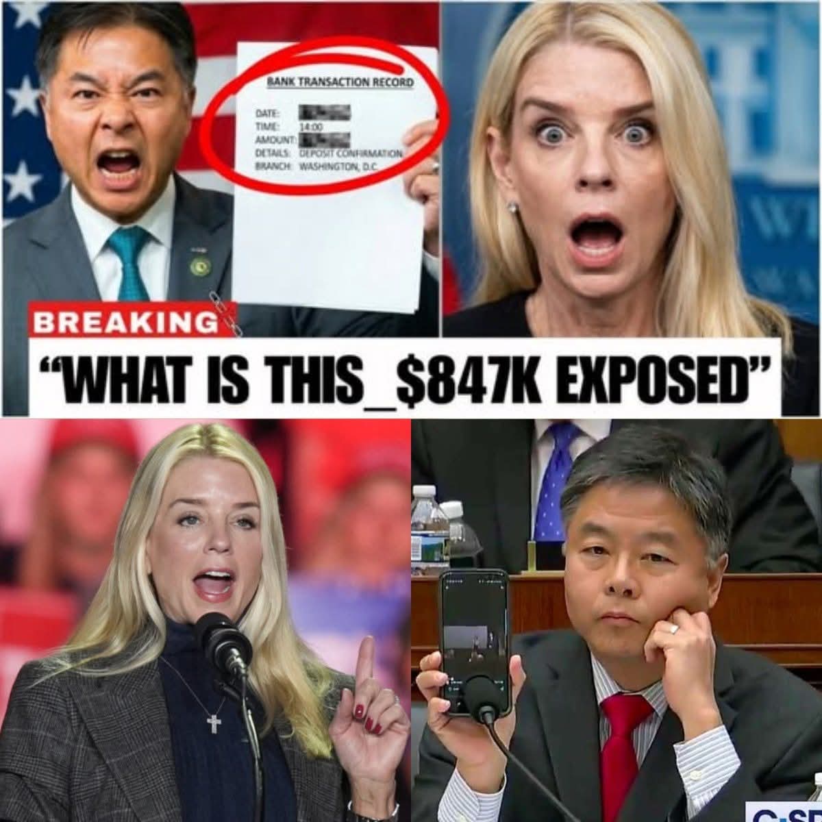 The halls of Congress were left in a stunned silence today as a single bank receipt threatened to topple a political titan. Rep. Ted Lieu, a former military prosecutor, produced a document that Pam Bondi never saw coming: an $847,000 wire transfer timestamped at 11:47 p.m. with her name on it. After hours of denying any knowledge of Epstein-related payments, Bondi was caught in a trap of her own making. The room watched in horror as she looked at her attorney, her knuckles turning white, before ultimately doing the unthinkable. She invoked her Fifth Amendment right against self-incrimination on live television. This isn’t just a political scandal; it’s a financial smoking gun that connects directly to the most protected list in history. How does an Attorney General explain 18 structured payments designed to bypass federal law? The truth is finally leaking out, and the implications are catastrophic. Full story and latest updates below 👇